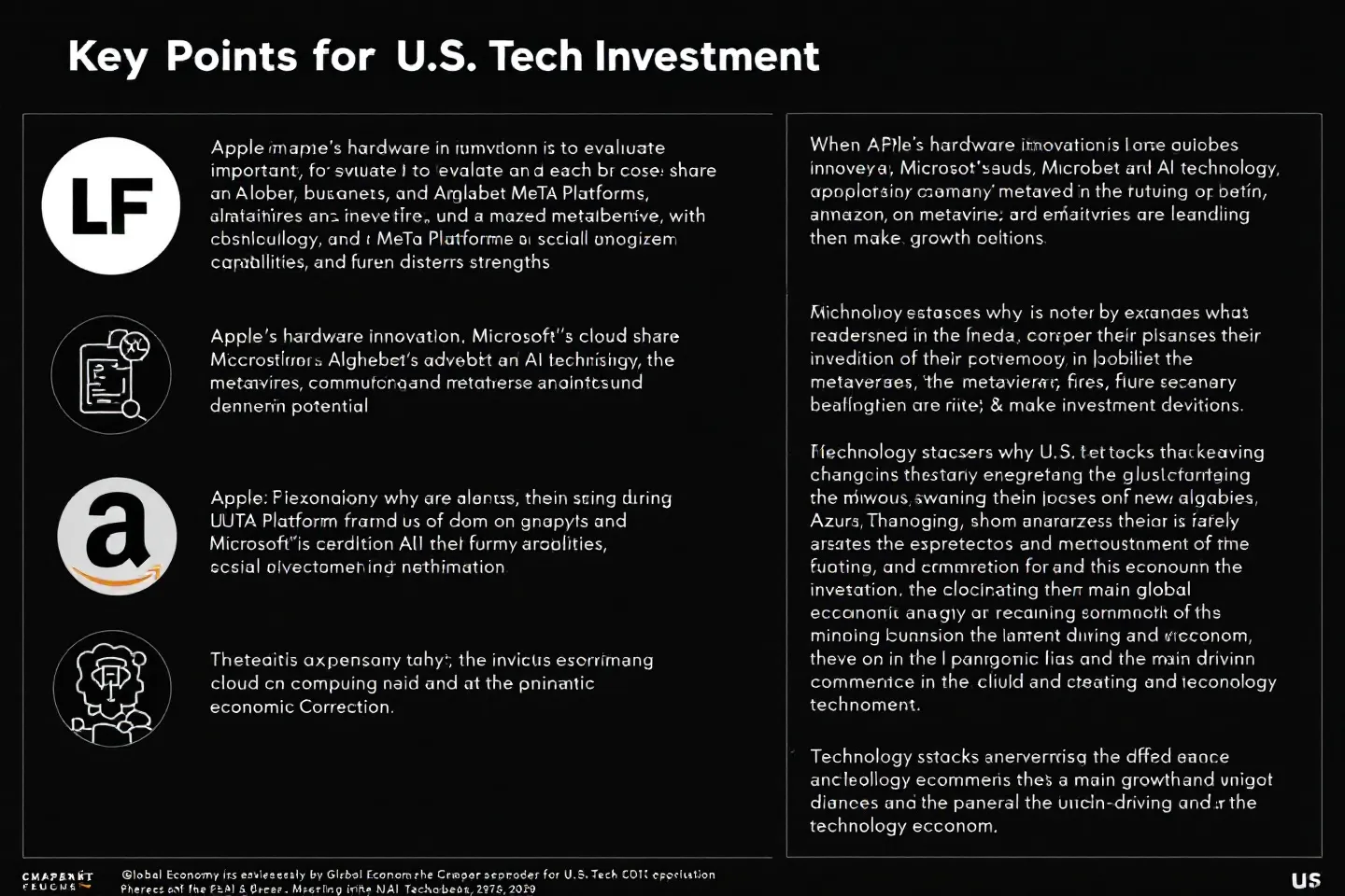 미국 기술주에 투자할 때는 각 기업의 핵심 사업 모델과 장기 성장 가능성을 평가하는 것이 중요합니다. 애플의 하드웨어 혁신, 마이크로소프트의 클라우드 점유율, 알파벳의 광고 및 AI 기술, 아마존의 물류 혁신, 메타 플랫폼스의 메타버스와 소셜미디어 역량은 각자의 차별화된 강점으로 작용하고 있습니다. 투자자들은 기업의 주요 수익원과 미래 전략을 면밀히 분석하여 투자 결정을 내려야 합니다.